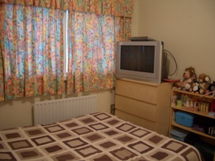 The main bedroom is equipped with a double-bed, mattress and duvet. On the side, a telephone is provided with a small chest of draws. The cupboards next to the bed have loads of space for clothes and other items on the top shelf of the bedroom. The room has 2 power points, radiator, window and telephone point.